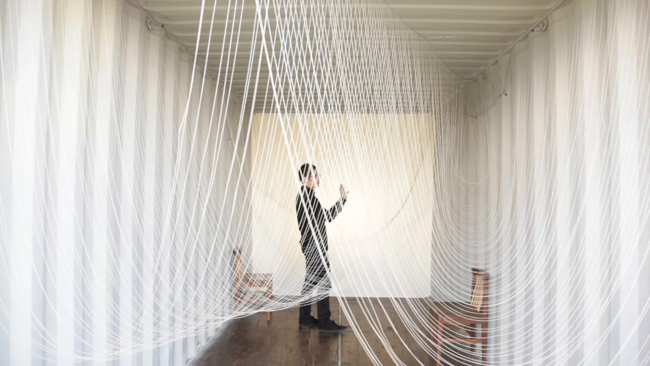 Numerous hanging steel wires create and divide ethereal space with Slack Circuit. These wires are fixed along a diagonal path, passed through a guide, and then connected to a moveable control chain. Raising or lowering these chains manipulate the shape of the hanging wires to form individual areas or ‘rooms’ within the space. The thin, kinetic environment moves both actively through human interaction and passively by the wind. Its light, airiness blurs the separation of space as the wires physically divide, yet still allow for visual connection through the entire space.